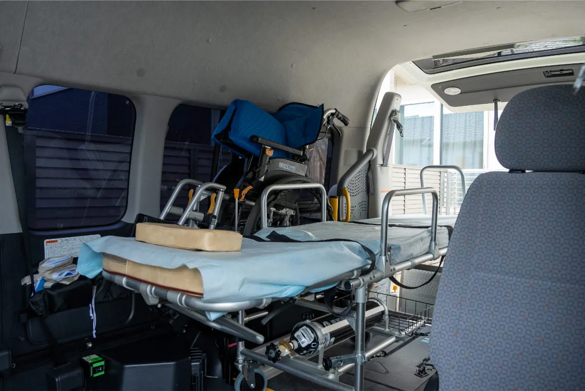 病院の通院や入退院、買い物や旅行など、日常から特別な場面まで幅広く対応しています。24時間いつでも対応できる体制を整えているため、緊急時のご利用もお任せいただけます。車椅子やストレッチャーを完備しており、お客様の状態に合わせてスタッフが乗り降りを介助いたします。玄関先の段差や階段なども安全に移動できるようにサポートし、目的地まで確実に送り届けます。